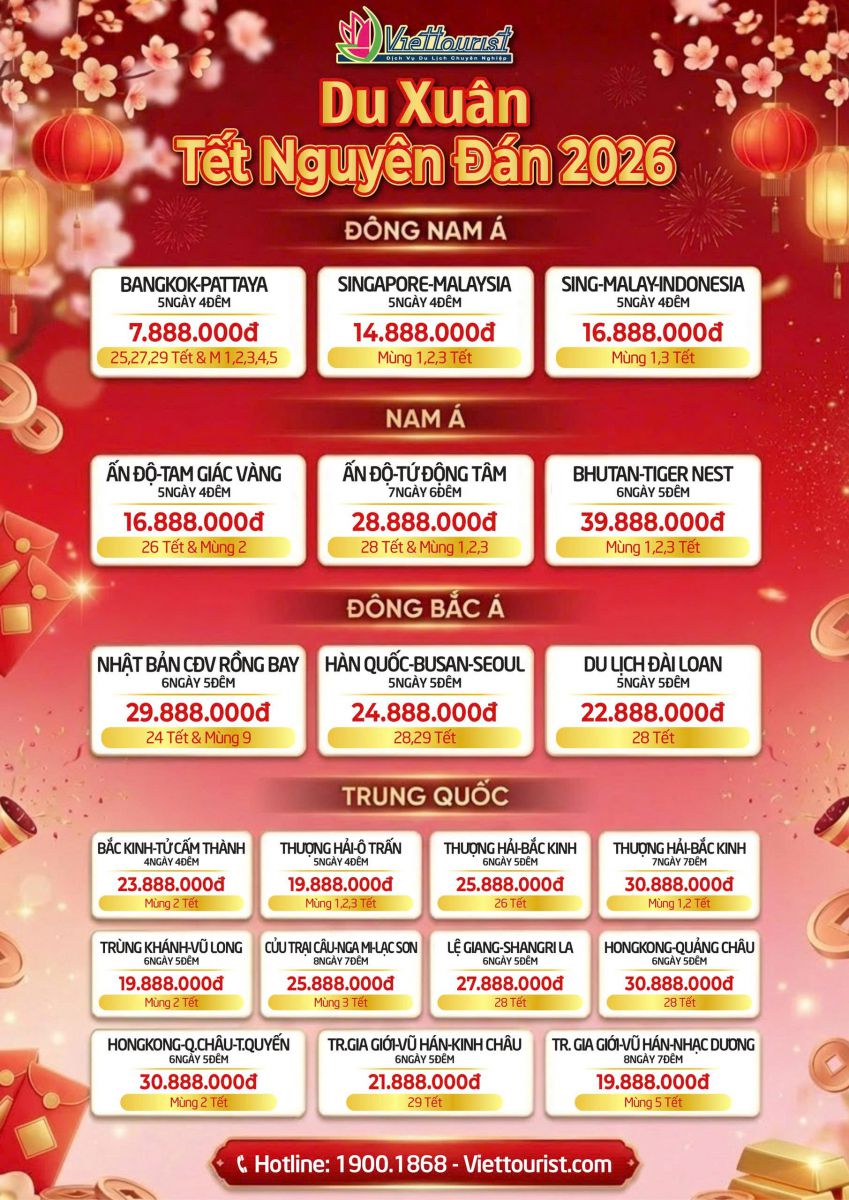 Viettourist mời Quý khách tham khảo thêm chùm tour Tết Nguyên Đán 2026 ( Đông Nam Á, Nam Á, Đông Bắc Á, Trung Quốc,...)