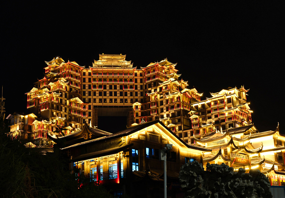 Toàn bộ công trình tái hiện kiến trúc nhà sàn Tujia truyền thống, lồng ghép kỹ thuật xây dựng hiện đại. Những khối nhà xếp tầng nối liền nhau tạo nên hiệu ứng thị giác mạnh, vừa mang dáng vẻ cổ kính vừa vô cùng hoành tráng. Đây là địa điểm lý tưởng để tham quan, tìm hiểu kiến trúc dân tộc và lưu giữ những bức ảnh độc đáo.