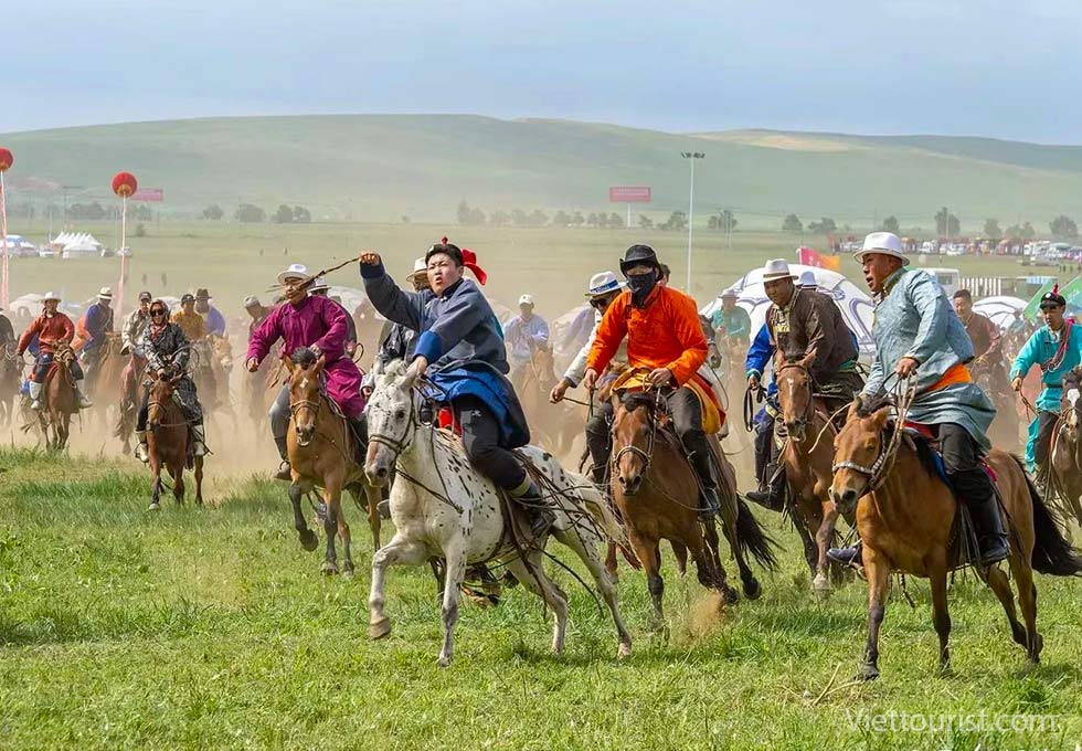 Hỏi bất kỳ ai thì họ đều sẽ nói với bạn rằng cuộc đua ngựa Naadam là sự kiện thú vị nhất tại lễ hội. Có ít nhất một cuộc đua ngựa giống, được gọi là azarga, và ít nhất ba, nhưng thường là năm, cuộc đua ngựa thiến. Chiều dài của cuộc đua phụ thuộc vào độ tuổi của ngựa, với khoảng cách 15 km đối với ngựa hai tuổi và 30 km đối với ngựa trên sáu tuổi, chẳng hạn.