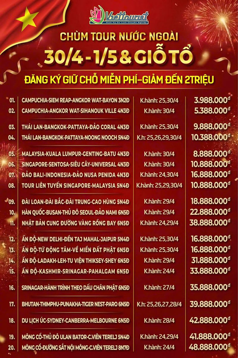 Kỳ nghỉ lễ 30/04 & 01/05 đang đến gần, bạn đã quyết định dành bao nhiêu ngày cho chuyến đi sắp tới? Để giúp bạn dễ dàng lựa chọn hành trình phù hợp nhất với kế hoạch cá nhân, Viettourist xin tổng hợp các tour khởi hành lễ được phân loại theo thời lượng chuyến đi.