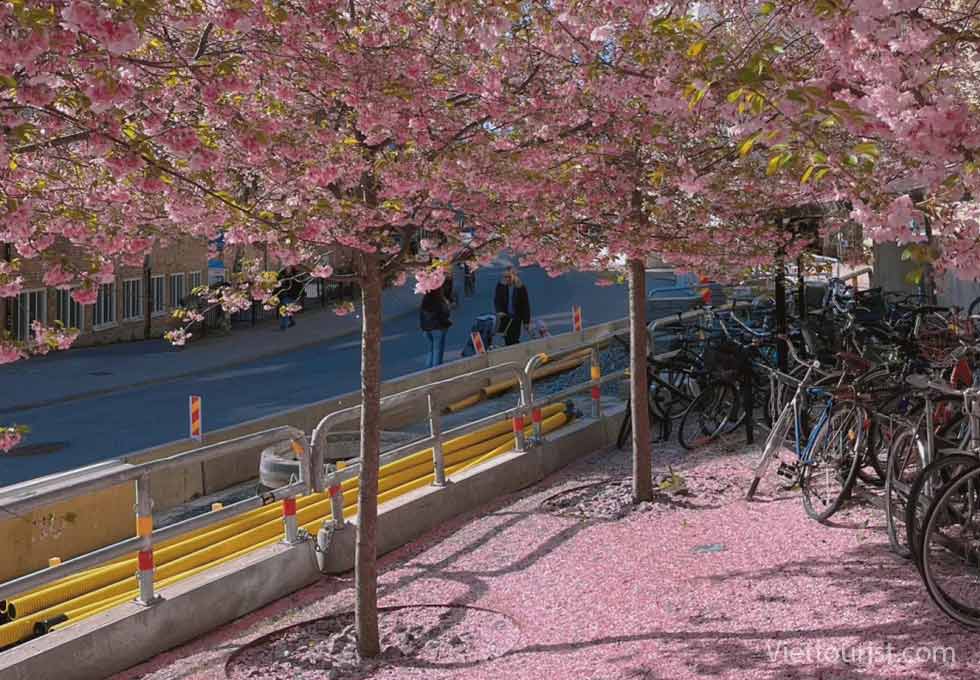 Hơn 100 cây hoa anh đào Nhật Bản chạy dọc theo con đường đạp xe ven sông tạo nên một dải lụa hồng mềm mại. Cảm giác đạp xe thư giãn dưới cơn mưa cánh hoa rơi là một trải nghiệm vô cùng lãng mạn.