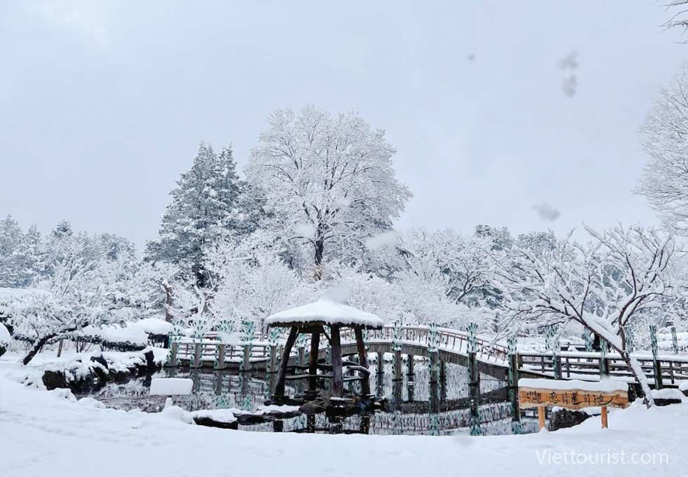 Tuyết trắng tại Shirakawa-go: Ngôi làng cổ tích hiện ra với những mái nhà phủ tuyết dày, ánh đèn vàng ấm áp hắt ra từ cửa sổ giữa đêm đông lạnh giá. Bạn sẽ được chiêm ngưỡng những mái nhà tranh Gassho-zukuri tại Shirakawa-go phủ đầy tuyết trắng, biến nơi đây thành một ngôi làng cổ tích có thật. Cảm giác ngâm mình trong suối nước nóng lộ thiên Onsen (như Ginzan Onsen hay Hakone) trong khi những bông tuyết nhẹ nhàng rơi trên vai là một trải nghiệm không thể quên, một liệu pháp thanh lọc cơ thể và tâm trí sau một năm dài