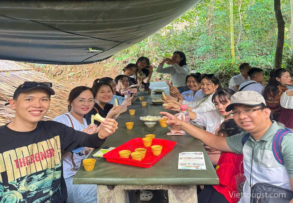 Địa đạo không chỉ để tham quan. Đến đây, bạn sẽ được mời thưởng thức “Bữa cơm Củ Chi” - những lát khoai mì chấm muối vừng, món ăn bình dị đã nuôi lớn biết bao thế hệ thanh niên xông pha trận mạc. Nhấm nháp miếng khoai, nghe kể chuyện về thời bom đạn, mới hiểu từng sợi khói bếp ngày xưa quý giá đến nhường nào.