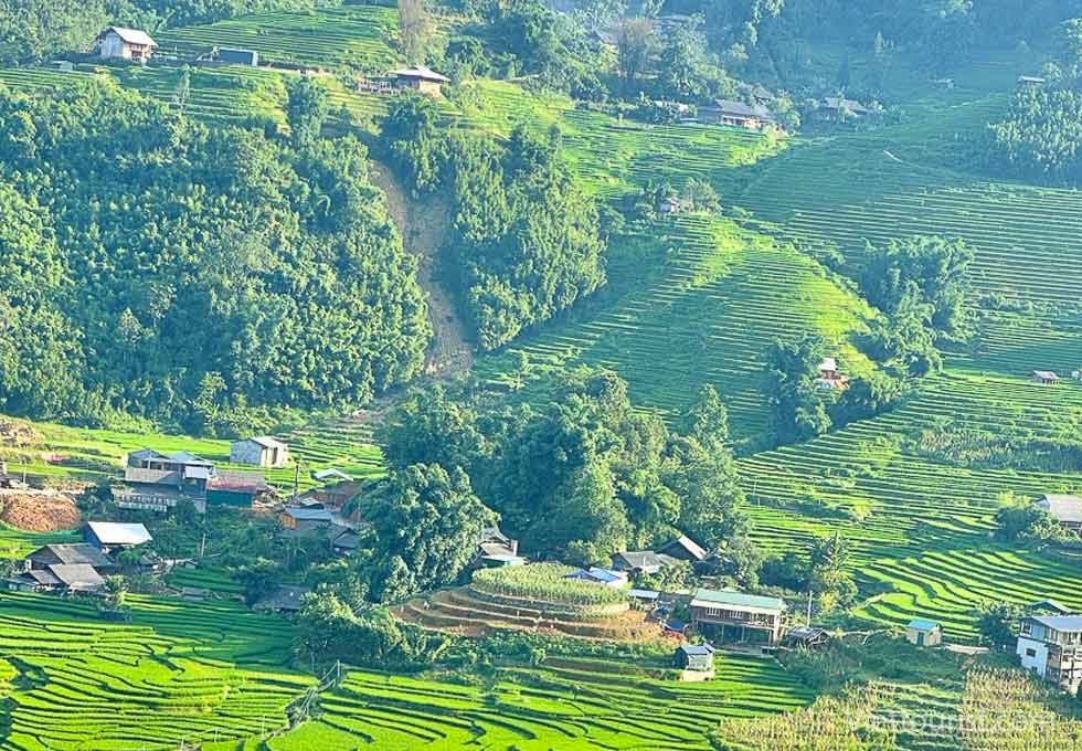 Không óng ánh như mùa lúa chín, những ngày này Sa Pa đang ngập sắc xanh mát mắt của các thửa ruộng bậc thang đang độ trổ bông.
