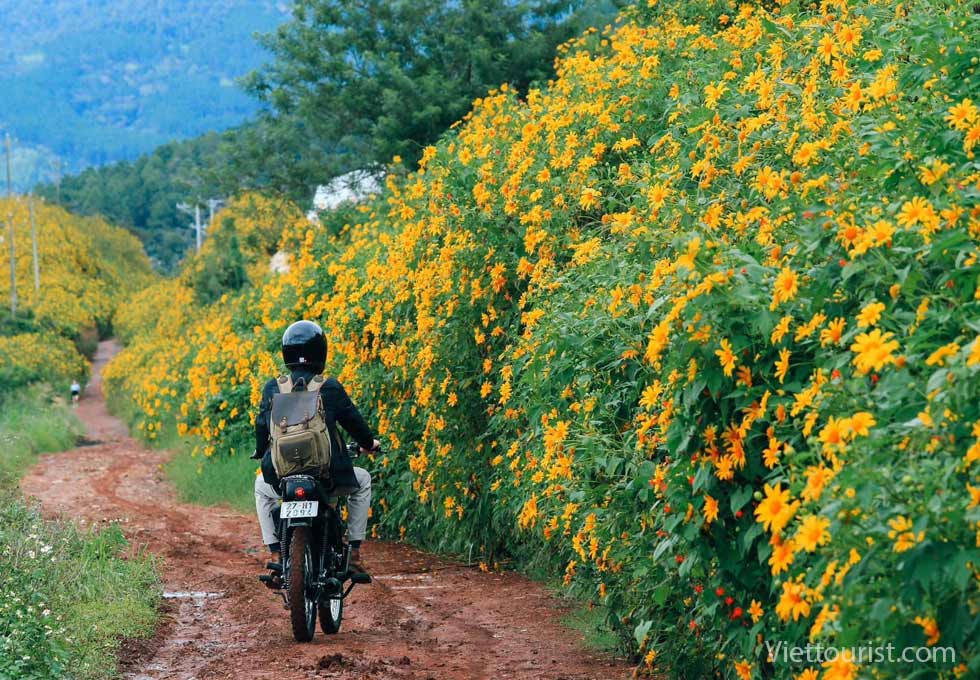 Du khách đến Tây Nguyên mùa Dã Quỳ thường chọn dạo bước hoặc rong ruổi trên xe máy qua các cung đường hoa, dừng lại bên những ngọn đồi phủ vàng để chụp ảnh, hít hà hương hoa ngai ngái hòa trong gió. Đó không chỉ là hành trình ngắm cảnh, mà còn là hành trình tìm về sự an yên, thuần khiết giữa đất trời bao la.
