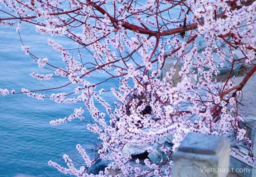 - Đẹp nhất: Tuần cuối tháng 3. Lúc này, hoa đào cánh đơn và đào rừng bung nở đồng loạt, tạo nên một dải lụa hồng bao quanh mặt hồ xanh biếc.
