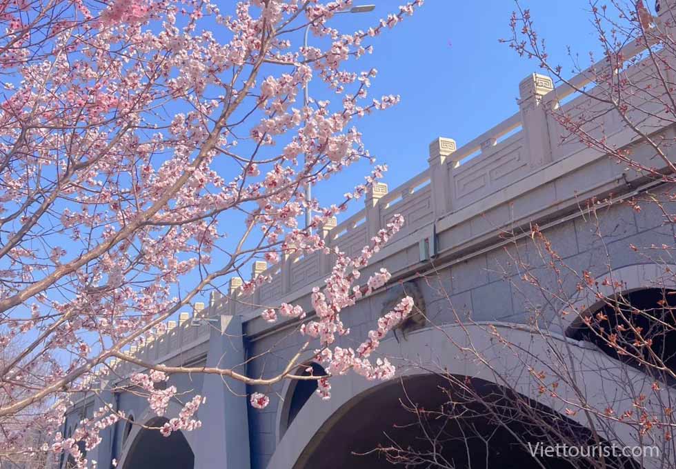 - Thưởng ngoạn kiến trúc đan xen sắc hoa: Chiêm ngưỡng những công trình kiến trúc cổ kính và hiện đại của thành phố thấp thoáng sau những nhành đào hồng phấn. Sự kết hợp này mang lại một cảm giác rất riêng biệt, vừa hoài cổ vừa tân thời.