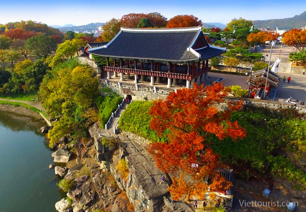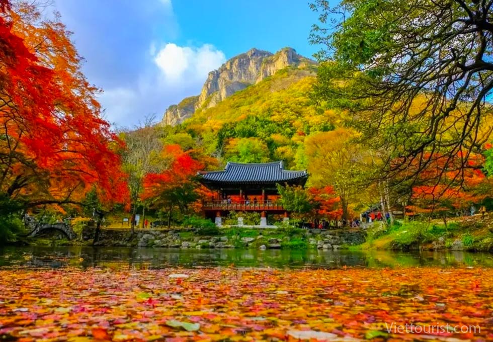 Nếu phải chọn một nơi được xem là “thủ đô mùa thu” của Hàn Quốc, chắc chắn Naejangsan sẽ là cái tên được xướng lên đầu tiên. Vườn quốc gia này nổi tiếng với hàng nghìn cây phong cổ thụ, vào mùa lá đỏ chúng tạo nên khung cảnh đẹp đến mức khiến người ta ngỡ như bước vào thế giới cổ tích. Điểm nhấn của Naejangsan là những ngôi chùa cổ như chùa Naejangsa, Beopjusa nằm ẩn mình giữa rừng, hòa quyện cùng mặt hồ phẳng lặng phản chiếu sắc lá đỏ cam rực rỡ. Đây là nơi hoàn hảo để du khách vừa tận hưởng thiên nhiên, vừa tìm chút tĩnh lặng và bình yên cho tâm hồn.
