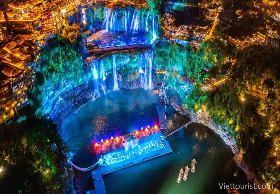 Nằm trên dãy núi Sùng Sơn, ở độ cao gần 1.000 m so với mực nước biển và sở hữu lịch sử hơn 2.000 năm, Phù Dung Trấn (Furong Ancient Town) được mệnh danh là “Thị trấn treo giữa lưng chừng trời” – một cảnh sắc kỳ bí và độc đáo của tỉnh Hồ Nam, Trung Quốc. Khái niệm thị trấn treo bắt nguồn từ cách thị trấn tọa lạc cheo leo bên vách đá, những dãy nhà cổ nằm san sát bên bờ vực và thác nước kỳ vĩ đổ xuống ngay cạnh khu dân cư.