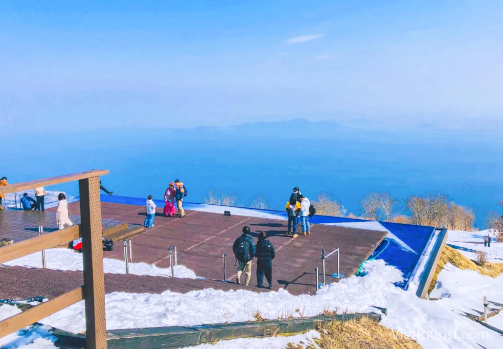 Hãy tưởng tượng bạn đang đứng trên đỉnh núi phủ đầy tuyết trắng, nhưng phía dưới là mặt Hồ Biwa rộng lớn, phẳng lặng như gương. Sự tương phản giữa sắc trắng lạnh giá của tuyết và màu xanh bao la của hồ tạo nên một khung cảnh hùng vĩ, xứng đáng là "background triệu view" cho mọi tín đồ du lịch.