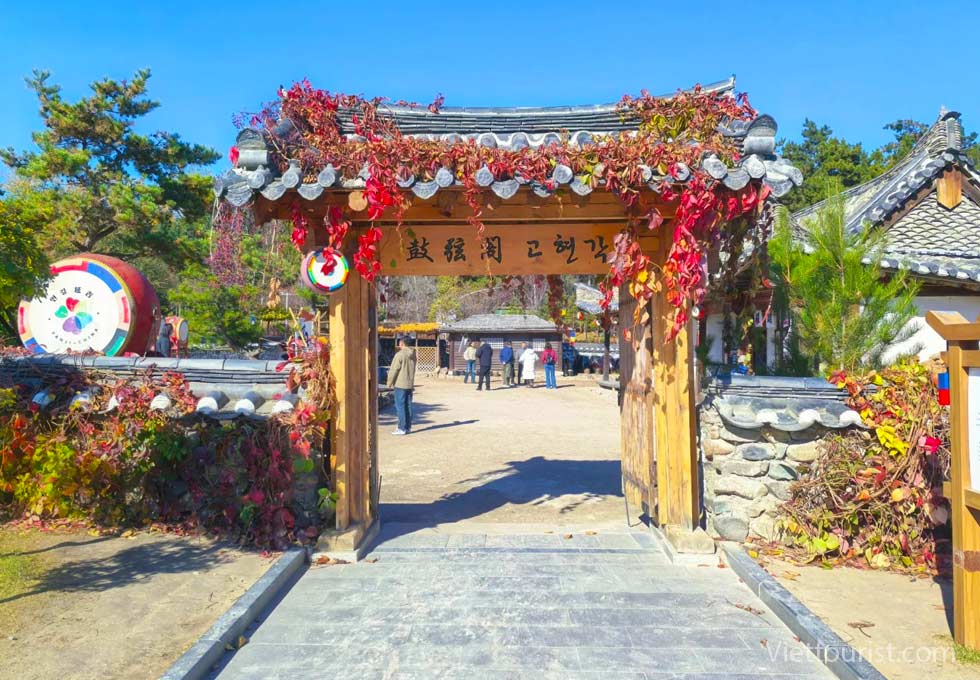 Bước qua cổng vào Vườn Dân Gian, bạn sẽ lập tức bị cuốn hút bởi khung cảnh làng quê Triều Tiên truyền thống: những mái nhà hanok cong vút lợp ngói đen, tường đất màu vàng ấm, sân vườn rực sắc hoa bốn mùa, cùng những chum kim chi lớn xếp ngay ngắn dọc lối đi. Tất cả gợi lên cảm giác yên bình, mộc mạc – khác biệt hoàn toàn với sự sầm uất của các thành phố lớn.