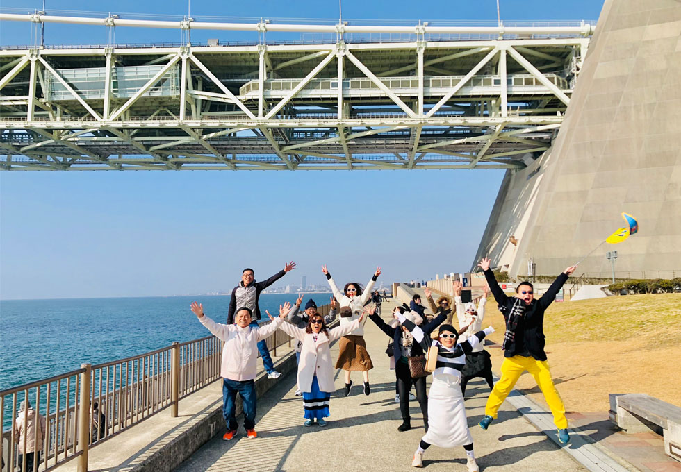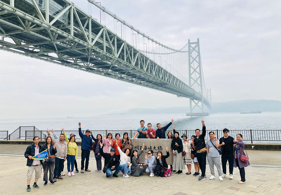 Đoàn dừng chân chụp hình bên ngoài Tháp truyền hình Tokyo Skytree hùng vĩ, một biểu tượng kiến trúc hiện đại của thủ đô.