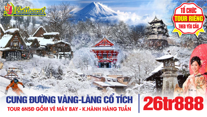 Tour du lịch Nhật Bản mùa đông 6N5Đ - CUNG ĐƯỜNG VÀNG LÀNG CỔ TÍCH SHIRAKAWA GO | NARITA - THỦ ĐÔ TOKYO - NÚI PHÚ SỸ - TOYAMA - TAKAYAMA - GIFU - THẮNG CẢNH HỒ BIWA - KYOTO - OSAKA