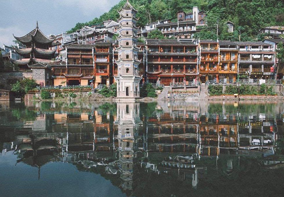 - Lầu Phong Thúy Hồng Kiều – chính là điểm nhấn nổi bật nhất trong tổng thể của Phượng Hoàng cổ trấn. Cầu vắt ngang dòng Đà Giang, nối liền đôi bờ trấn cổ, không chỉ mang ý nghĩa về giao thông mà còn là biểu tượng của nơi đây
