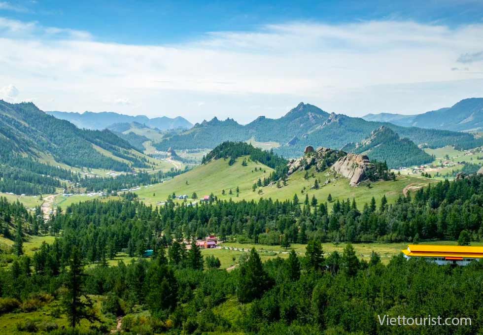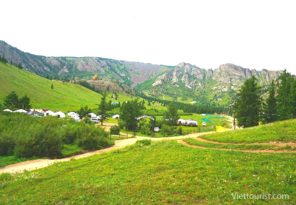 Đá Rùa (Turtle Rock): Tảng đá granite khổng lồ có hình con rùa, biểu tượng nổi tiếng của công viên. Núi non và thảo nguyên: Dãy núi đá granite sừng sững, thung lũng xanh mướt, và dòng sông Terelj uốn lượn tạo nên khung cảnh thơ mộng.