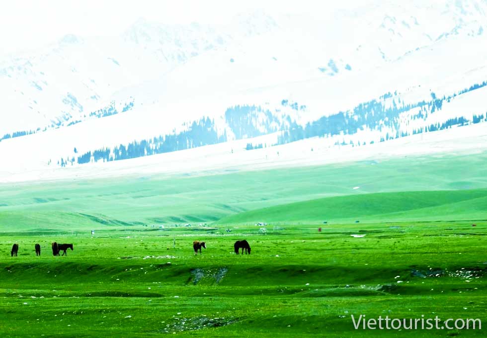 Đồng cỏ Hegu (Đồng cỏ Thung lũng sông ) nổi tiếng với địa hình thung lũng và sự kết hợp giữa đồng cỏ và nước. Trên đường đến đồng cỏ Hegu, những đỉnh núi phủ tuyết, rừng rậm, đồi xanh, đồng cỏ bằng phẳng… dần hiện ra trước mắt bạn.