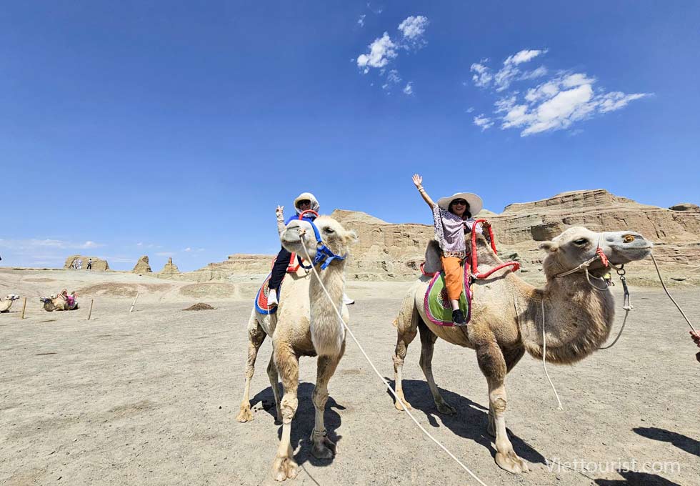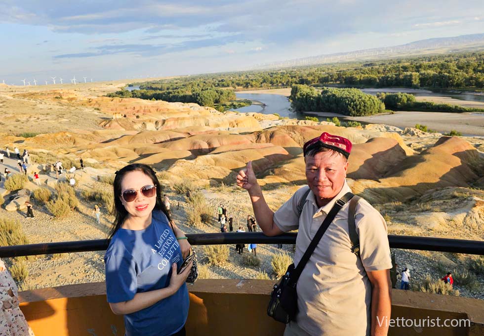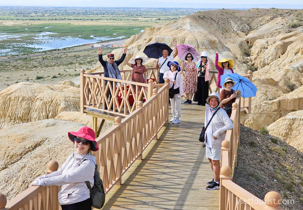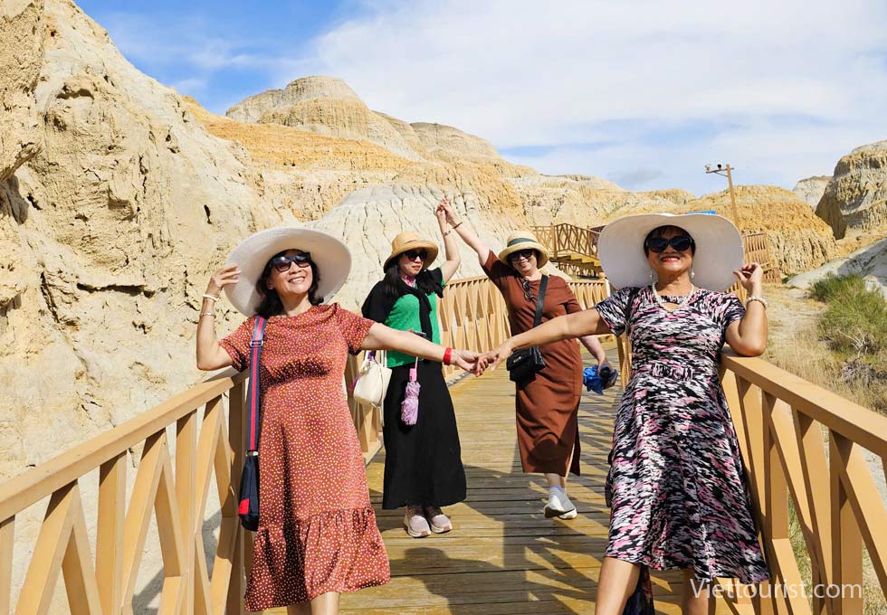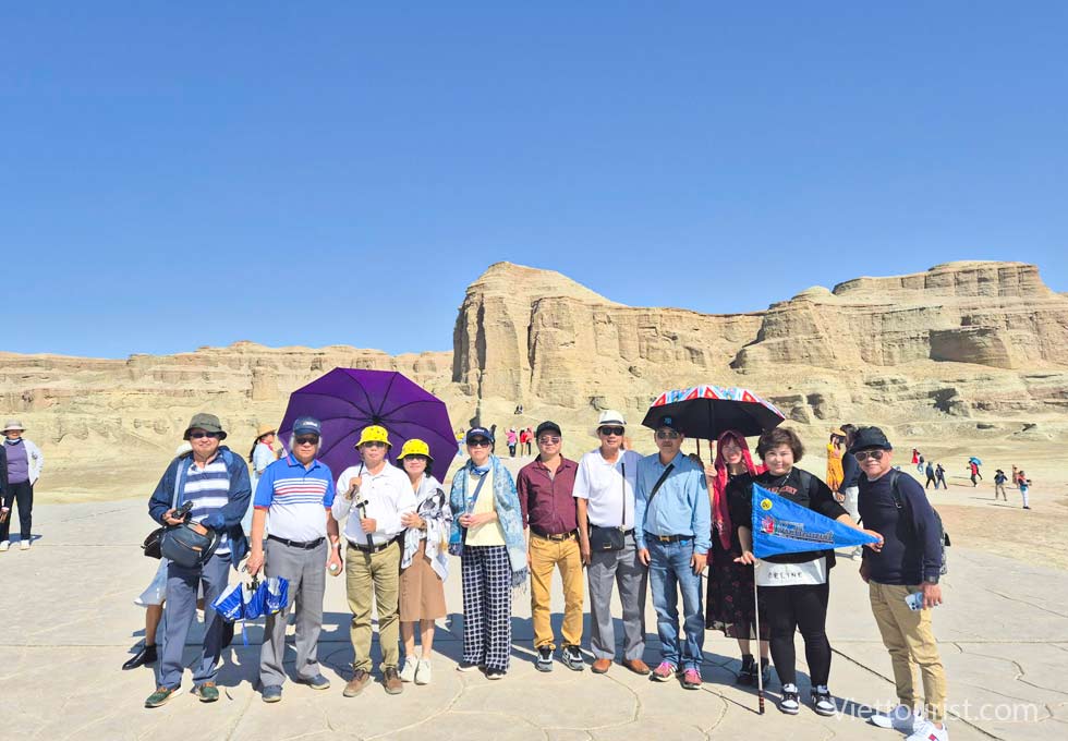 Đến giờ đoàn khởi hành đi Thành phố ma Urho (Ô Nhĩ Hoà) : "Yadan" là một thuật ngữ địa lý, có nghĩa là "gò đất dựng đứng" trong tiếng Uyghur, và dùng để chỉ một địa hình đặc biệt ở những khu vực khô hạn. Theo thời gian, sự xói mòn do gió và nước tạo ra các cột đá hoặc trụ đá, trông giống như một thành phố bị bỏ hoang, nơi được gọi là "Thành phố rồng" trong cổ thư. Mặt đất xung quanh Thành phố ma khô cằn và nứt nẻ, và một số bụi cây nhỏ như gai lạc đà nằm rải rác trên mặt đất. Những ngọn núi hình bàn thạch được tạo thành từ các lớp đất đá màu đỏ và đá vôi xanh đã trải qua hàng triệu năm xói mòn bởi nước và tác động của gió và cát, trông giống như những bức tường thành cổ, pháo đài hay cung điện, và có nhiều cảnh quan động vật và thực vật sống động như thật. Vào mỗi mùa hè và mùa thu, nơi đây thường xuyên có những cơn gió mạnh cấp bảy, cấp tám thổi qua, gió thổi dọc theo thung lũng, cuốn cát sỏi phát ra âm thanh chói tai, như ma khóc sói tru, vì vậy mà có tên gọi "Thành phố ma quỷ". Nơi đây có thể được gọi là một bảo tàng tự nhiên, và phong cảnh ở đây là độc nhất vô nhị, nhiều bộ phim sử dụng bối cảnh tại Thành phố ma, như bộ phim đoạt giải Oscar "Ngọa hổ tàng long". Địa hình được chọn quay là địa điểm đẹp nhất trong cuộc bình chọn "Địa hình Yadans đẹp nhất Trung Quốc" được tổ chức bởi "Viện Địa lý Quốc gia Trung Quốc".