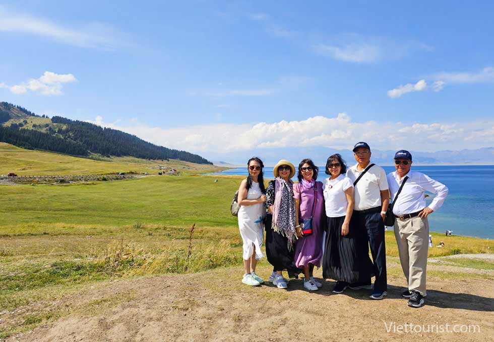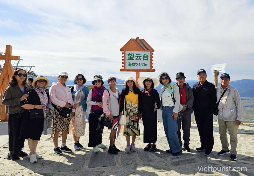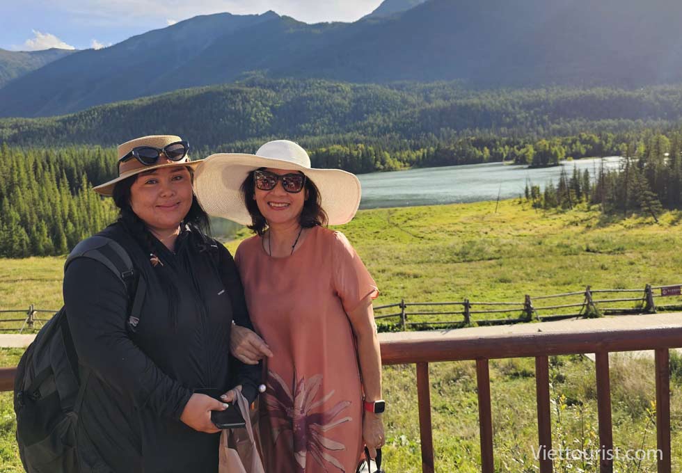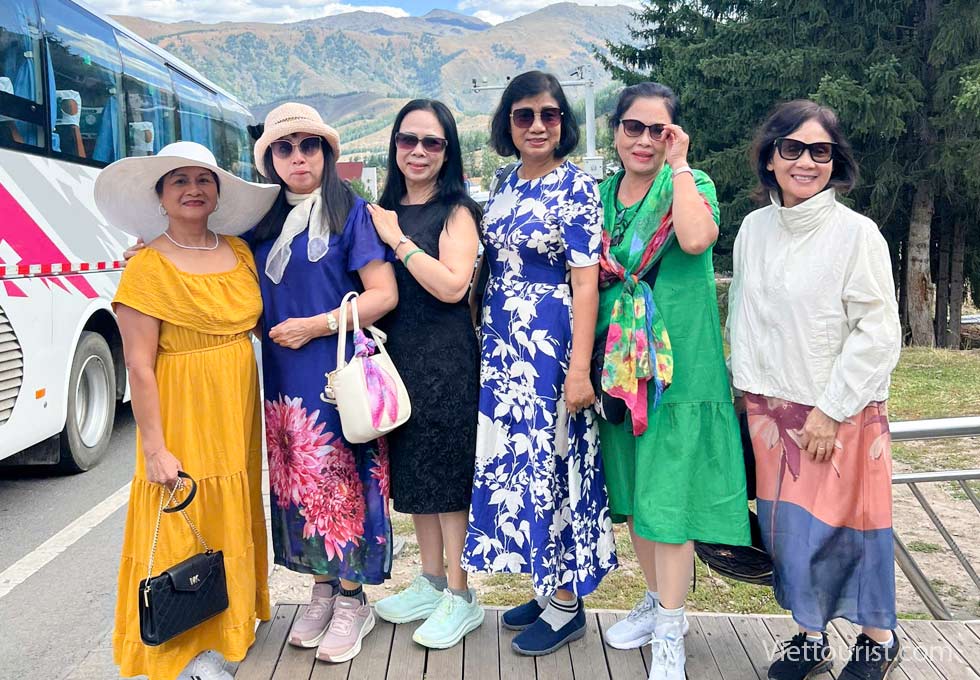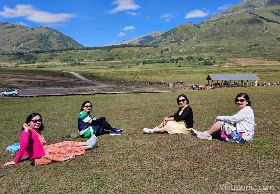 Đoàn ăn trưa trong khu du lịch và trải nghiệm khám phá 5 điểm du lịch gồm khu thắng cảnh Karajun Đông và Tây, khu thắng cảnh đỉnh núi tuyết Zhongtian, khu thắng cảnh rừng Thiên Lai và khu thắng cảnh hẻm núi Kuokesu. Đồng cỏ được ví như “tấm lưng trần của thiếu nữ” nằm ở khúc quanh giữa khu thắng cảnh và hồ cá sấu gần đó.