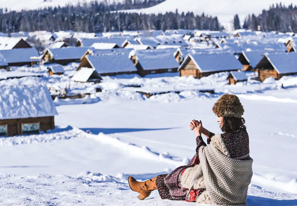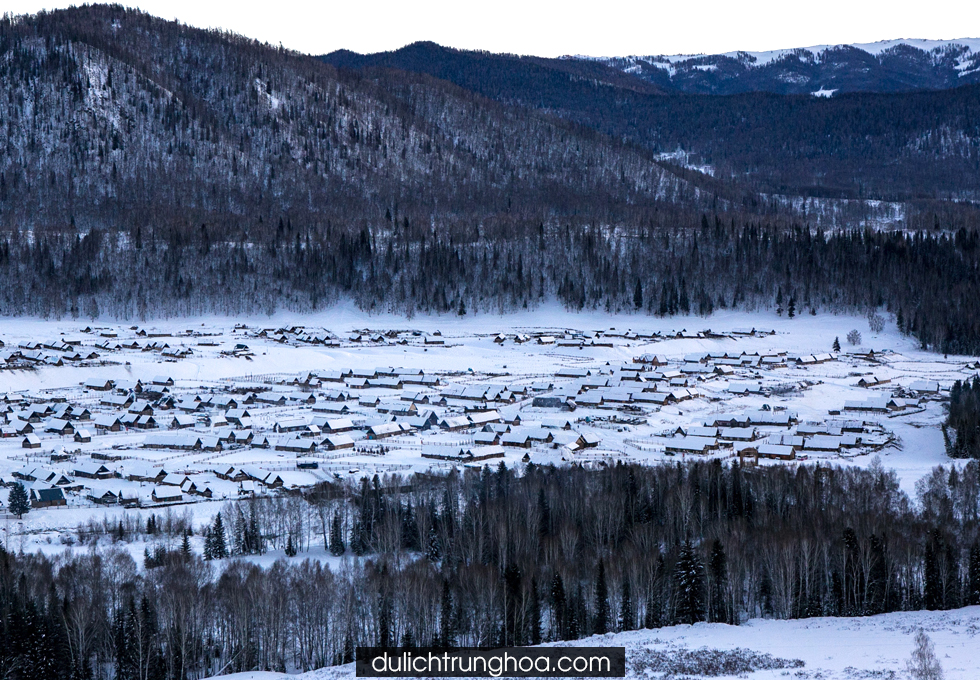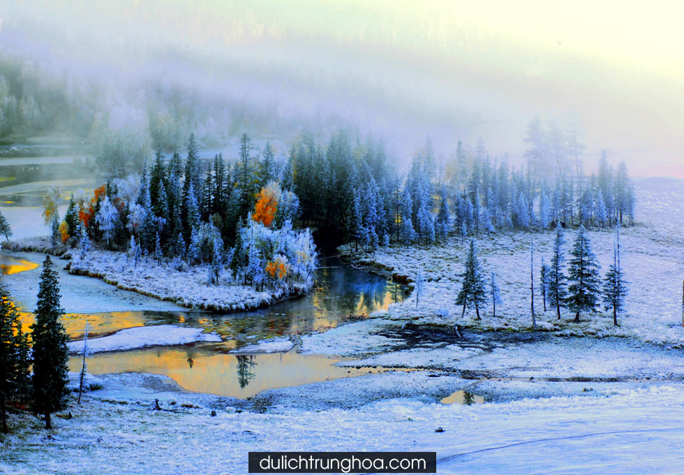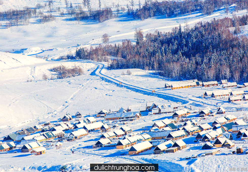 Vào mùa Đông, cả làng Hòa Mộc Tân Cương lại chìm trong bầu không khí trắng xóa của tuyết phủ. Tuyết phủ trắng mọi nóc nhà và thung lũng. Rừng bạch dương nhuốm trắng, sông Hòa Mộc đôi khi đóng băng. Cả làng như ẩn hiện trong làn sương lạnh, giống bản làng trong truyện cổ tích Bắc Âu. Không khí yên bình, tĩnh lặng – đẹp theo kiểu hoang dã và nguyên sơ.