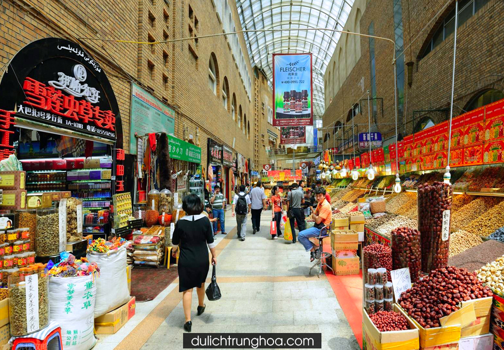 - Đến Urumqi - xe và HDV địa phương đón đoàn tham quan:Chợ lớn quốc tế Erdaoqiao nằm trong Vòng tròn kinh doanh Erdaoqiao ở cuối phía nam của quận Tianshan, Urumqi.Erdaoqiao International Grand Bazaar là một khu phố theo phong cách Hồi giáo kết hợp giữa hiện đại và cổ xưa, những mái nhà hình mái vòm màu xanh và bạc rất uy nghiêm và lộng lẫy, được gọi là "Cửa sổ vào Tân Cương", "Cửa sổ vào Trung Á" và "Cửa sổ vào Thế giới", là nơi tập trung, trung tâm triển lãm các sản phẩm du lịch Tân Cương. Các sản phẩm được bán bao gồm: trang phục dân tộc, mũ hoa dân tộc, dao dân tộc, đồ trang sức dân tộc, thủ công mỹ nghệ dân tộc, nhạc cụ dân tộc , trái cây Tân Cương, đồ đồng Pakistan, thuốc dân tộc (sen tuyết, gạc, nấm linh chi, cây rum, đông trùng hạ thảo,bạch chỉ,v.v.) Các loại thảm, thảmtrang trí và hàng dệt kim dân tộc nhập khẩu từ Thổ Nhĩ Kỳ. Có nhiều sản phẩm mang đậm phong cách dân tộc...
