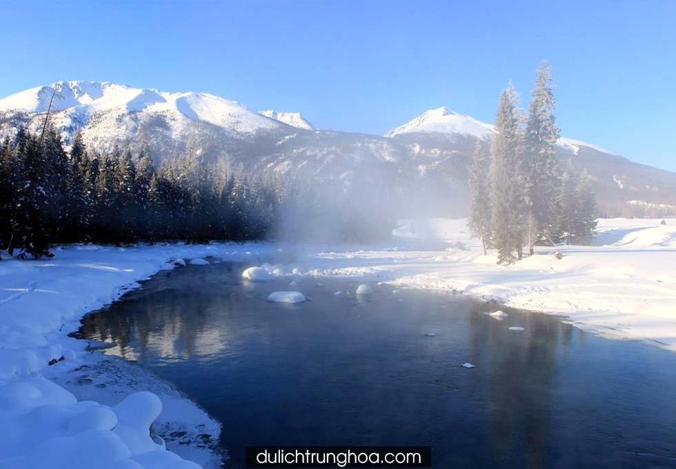 - Vịnh Ngọa Long: là nơi dòng Kanas uốn lượn như con rồng nằm, mùa đông thể hiện rõ nhất hình dáng đặc biệt này. Phần lớn mặt sông đóng băng, nhưng đường cong của lòng sông vẫn nhìn rõ từ trên cao, khiến hình dáng “rồng nằm” càng nổi bật. Băng phủ tạo hoa văn tự nhiên, kết hợp ánh nắng tạo thành các mảng sáng tối tuyệt đẹp. Rừng thông hai bên bờ giữ màu xanh đậm, đối lập với mặt sông trắng xóa.